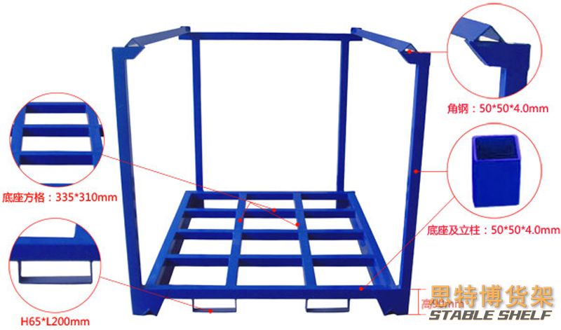 堆垛架,可相互堆3到4層,形成立體存儲(chǔ)模式,無(wú)需借助貨架、倉(cāng)儲(chǔ)籠和托盤等設(shè)備,適合用在租賃倉(cāng)庫(kù)、低矮的老式倉(cāng)庫(kù)或車間暫存區(qū)等不適合投資貨架的區(qū)域。