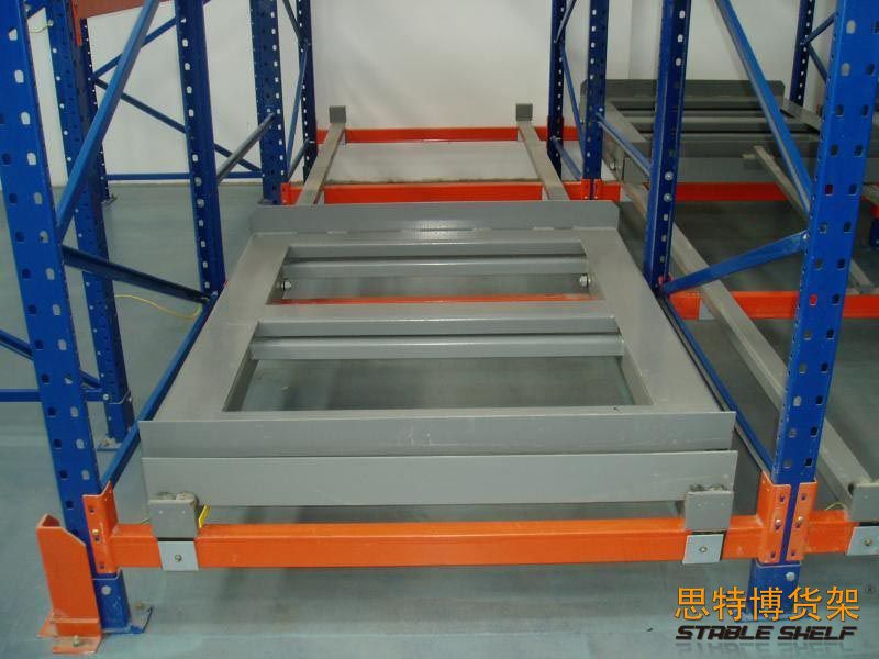 壓入式貨架又名后推式貨架——是在前后梁間以多層臺車重疊相接,從外側(cè)將疊棧貨物置于臺車推入,后儲存之貨品會將原先貨品推往里面。壓入式貨架是由托盤小車等典型結(jié)構(gòu)件組成,托盤車具有可流動特性,貨物被規(guī)定于貨架的一端進(jìn)出,并遵循先進(jìn)后出順序。儲運貨物時叉車只位于貨架通道水平較低的一端作業(yè),無需進(jìn)入貨架貨物存儲通道。此類貨架具有存儲密度高,儲運速度快的典型特征。通常用于存儲場地極其有限,但需要增加存儲容量或?qū)ω浳镉袝r間要求等對貨物揀選要求不高的場合使用。壓入式的優(yōu)點就是節(jié)約作業(yè)通道數(shù)量,對叉車要求不高,可以有效提高利用率,主要應(yīng)用在倉庫空間不足,而且倉庫的面積又不大的地方;而且貨品要符合可以先進(jìn)后出的位置。